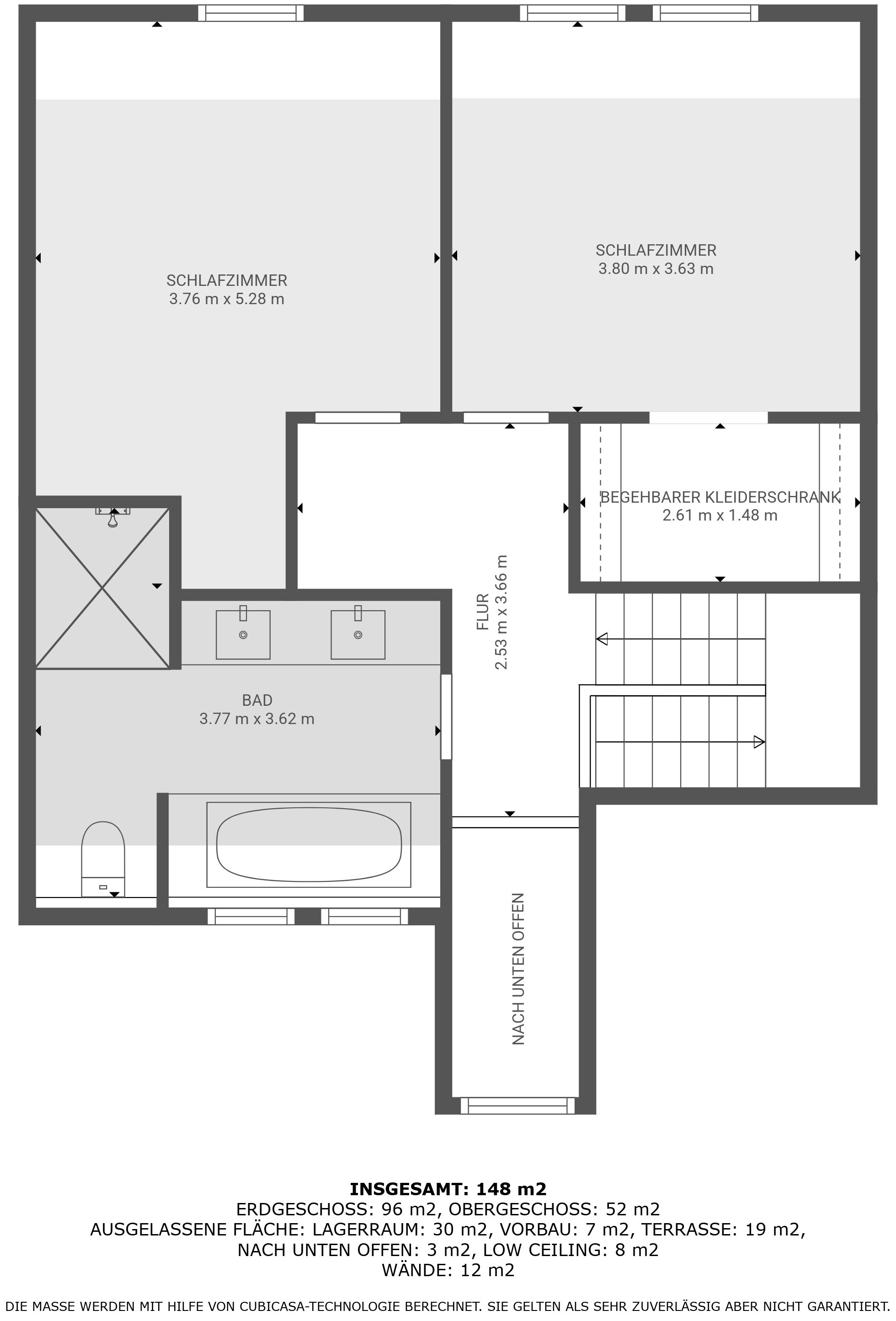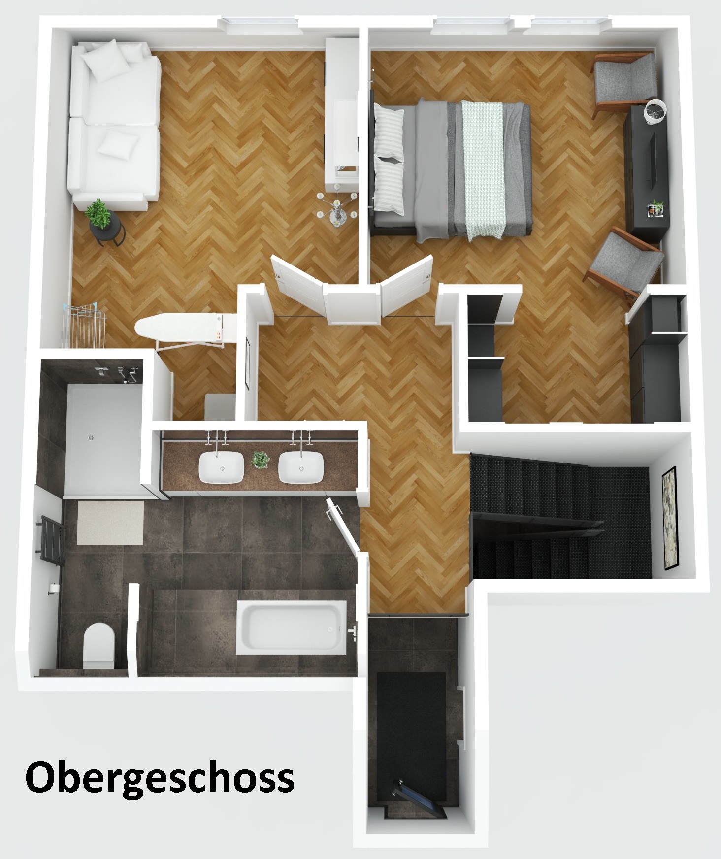 Das Obergeschoss begeistert durch seine großzügige Höhe, sichtbare Balken und helle Atmosphäre. Hier stehen zwei weitere Räume zur Verfügung, darunter ein Schlafzimmer mit begehbarer Ankleide. Das stilvolle Bad überzeugt mit großformatigen Fliesen, Doppelwaschtisch, bodengleicher Dusche und freistehender Wanne – edel akzentuiert durch bronzefarbene Elemente und ein harmonisches Lichtkonzept.