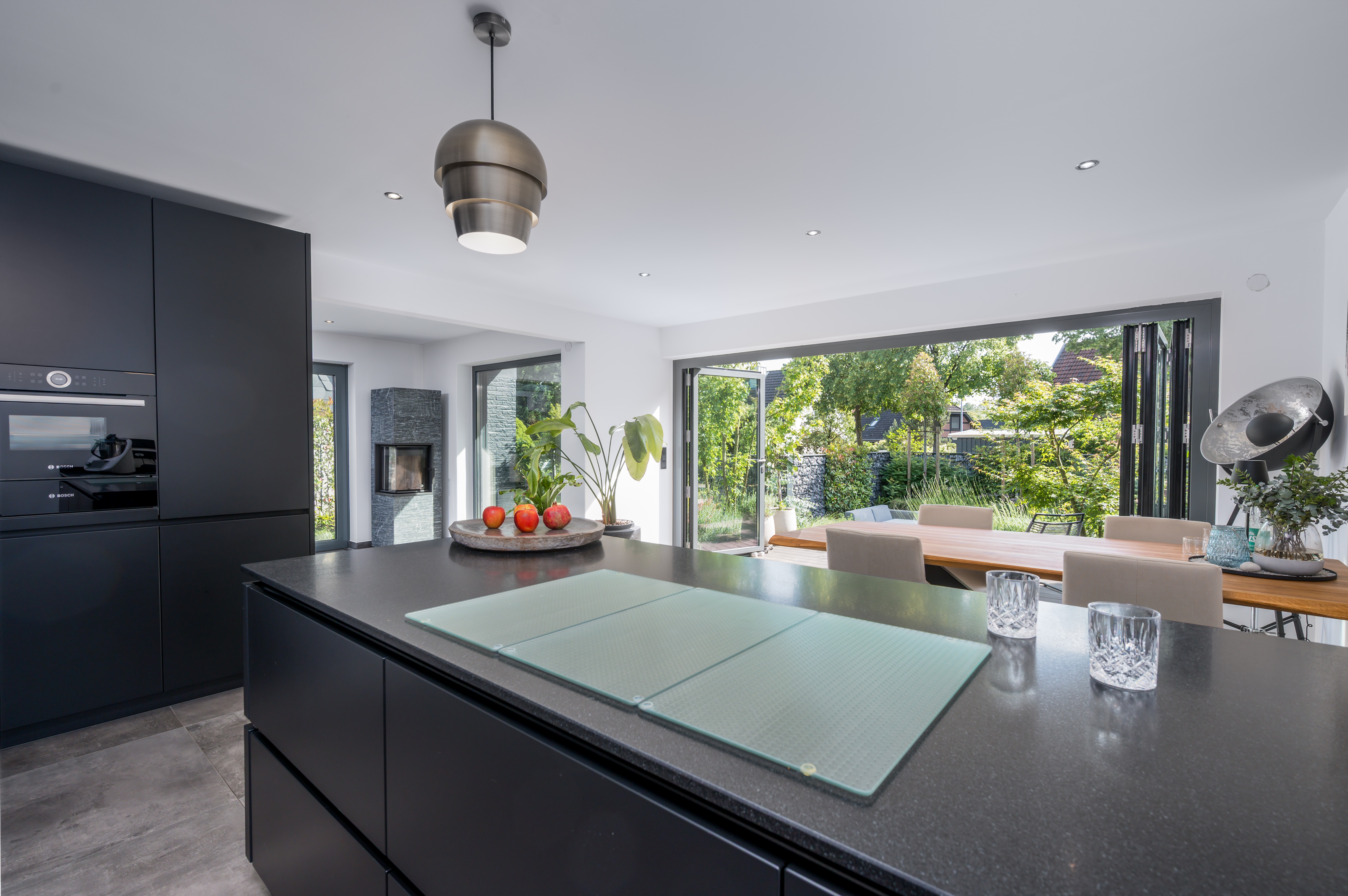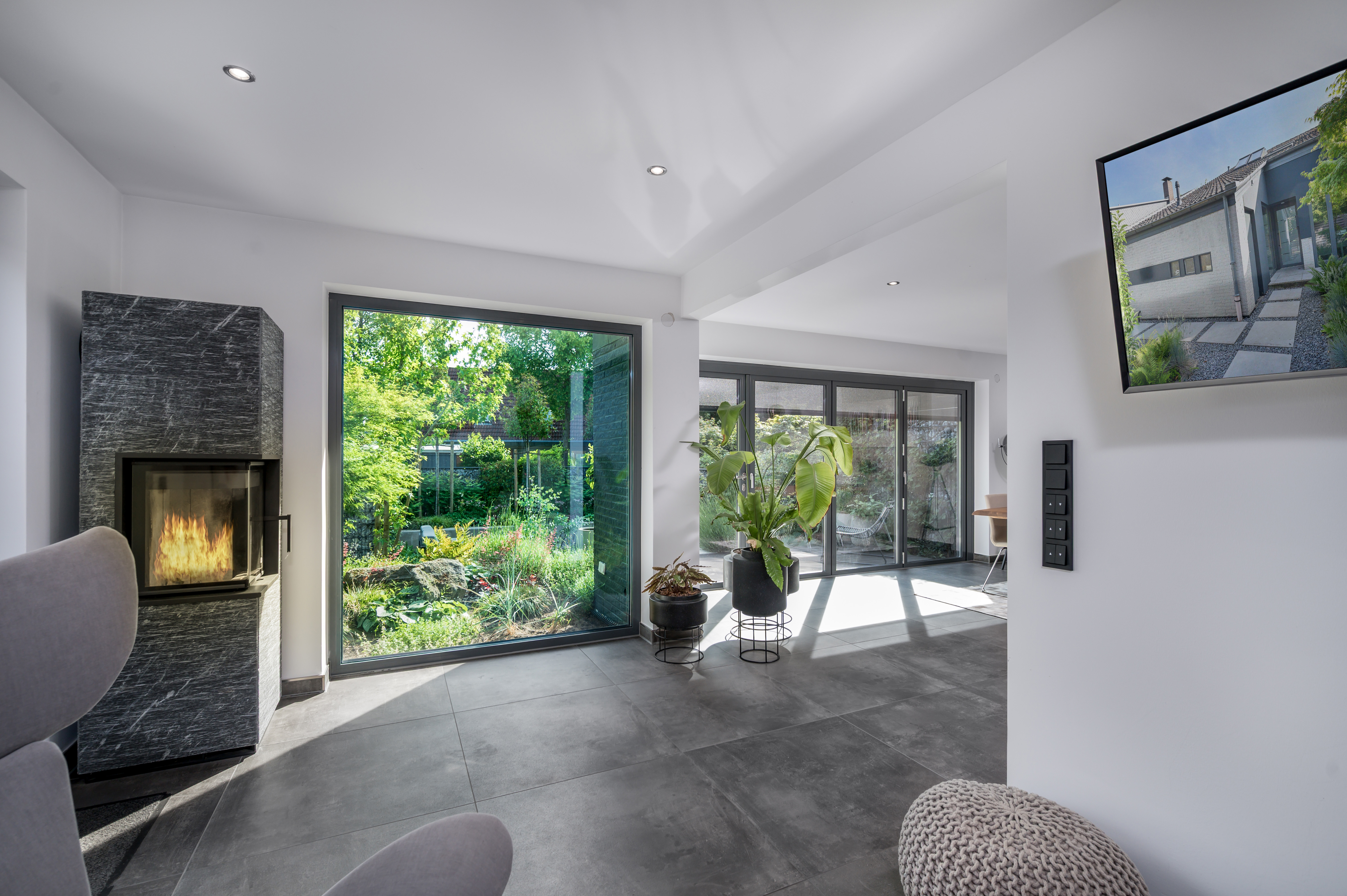Der großzügige Wohn- und Essbereich mit offener Küche und Kücheninsel bildet das Herzstück des Hauses. Durch großflächige Schiebetüren öffnet sich der Raum zur Terrasse und in den liebevoll angelegten Garten mit Wasserelement – ein Ort zum Entspannen und Genießen. Der fließende Übergang von Innen und Außen unterstreicht das offene, luftige Raumgefühl.