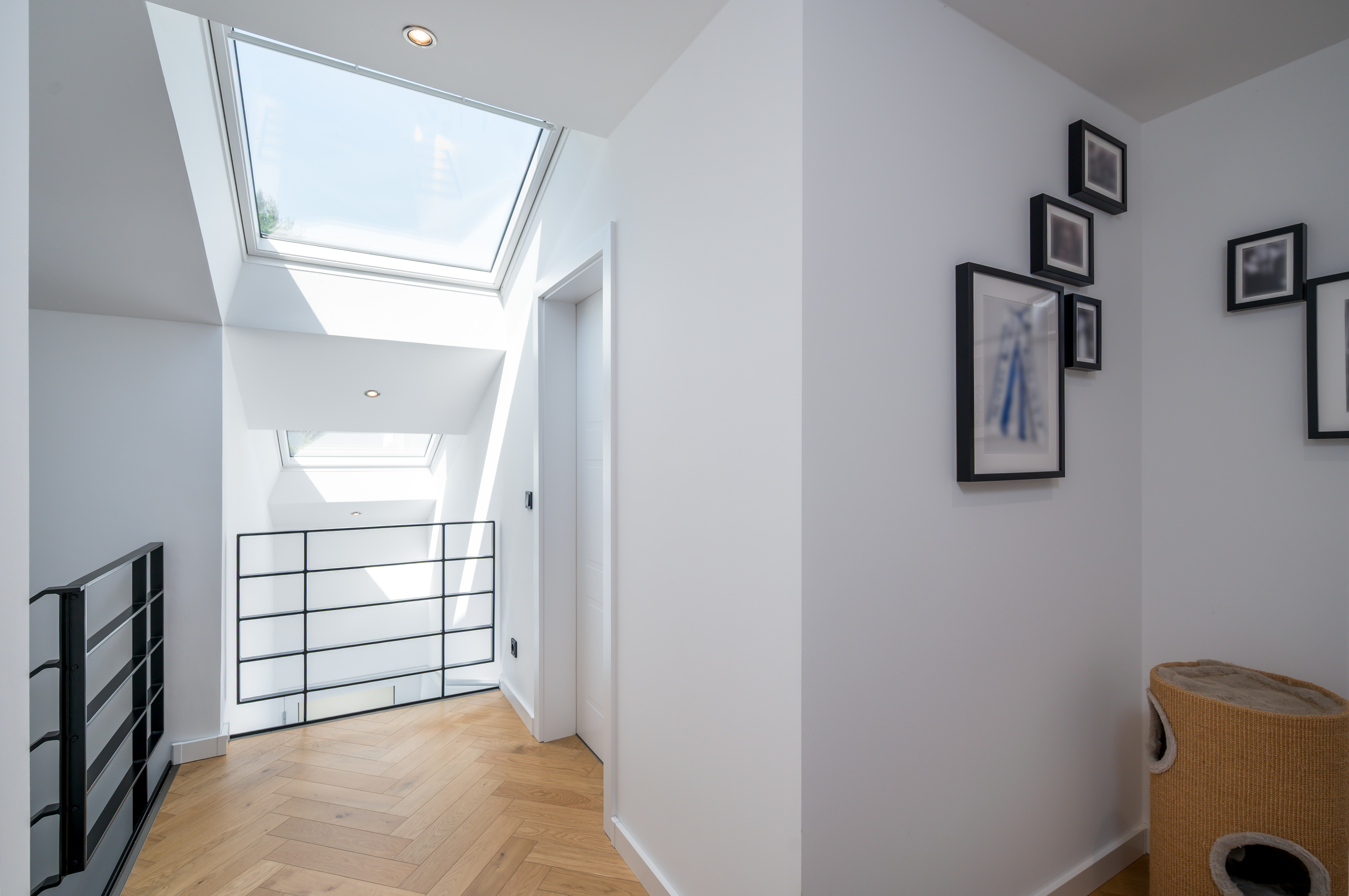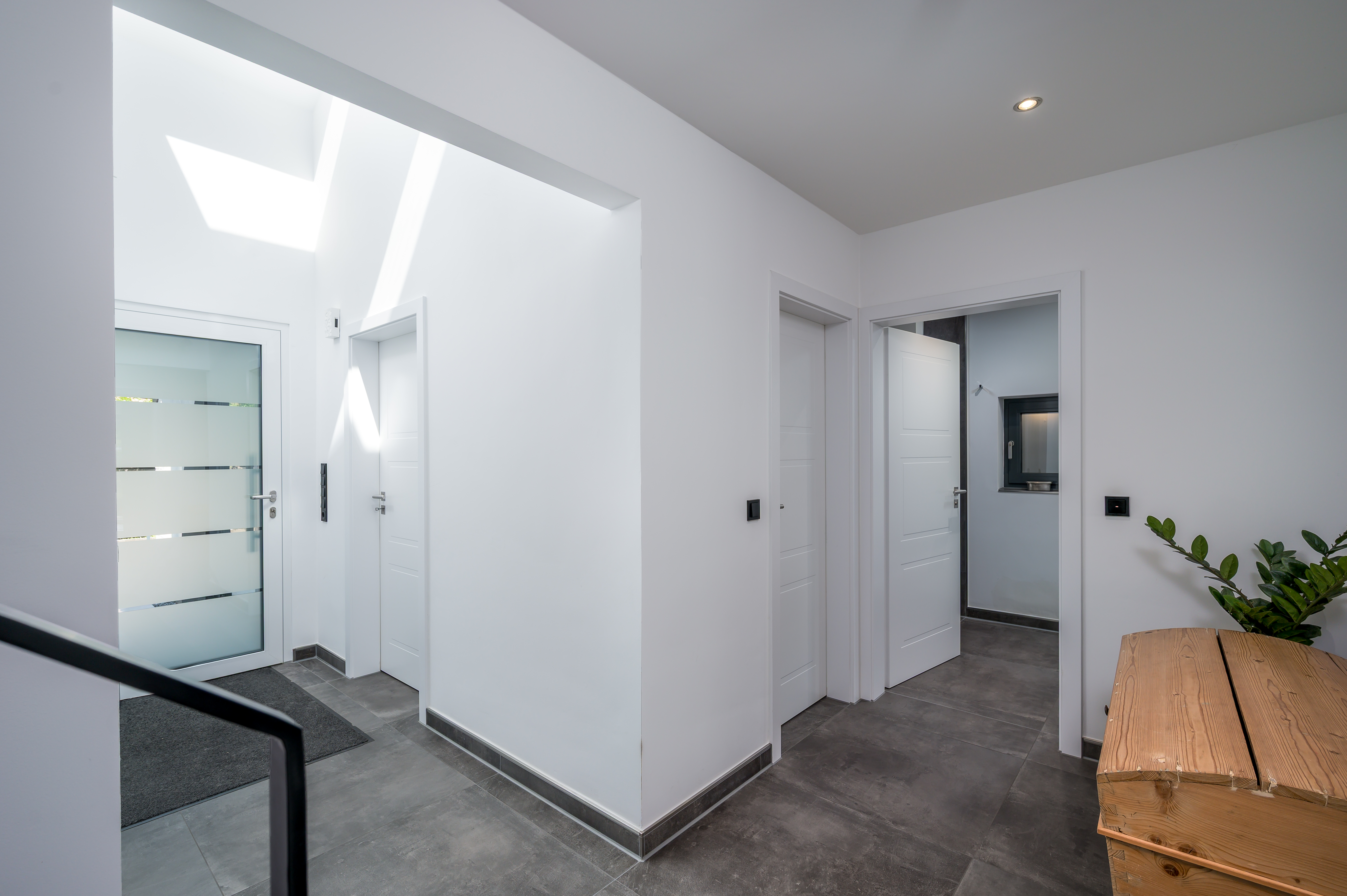 Im Erdgeschoss befinden sich außerdem zwei flexibel nutzbare Zimmer, ein modernes Duschbad sowie praktische Abstellflächen. Der elegante Eingangsbereich mit Galerie und Blick in das Obergeschoss vermittelt bereits beim Betreten eine außergewöhnliche Raumwirkung.