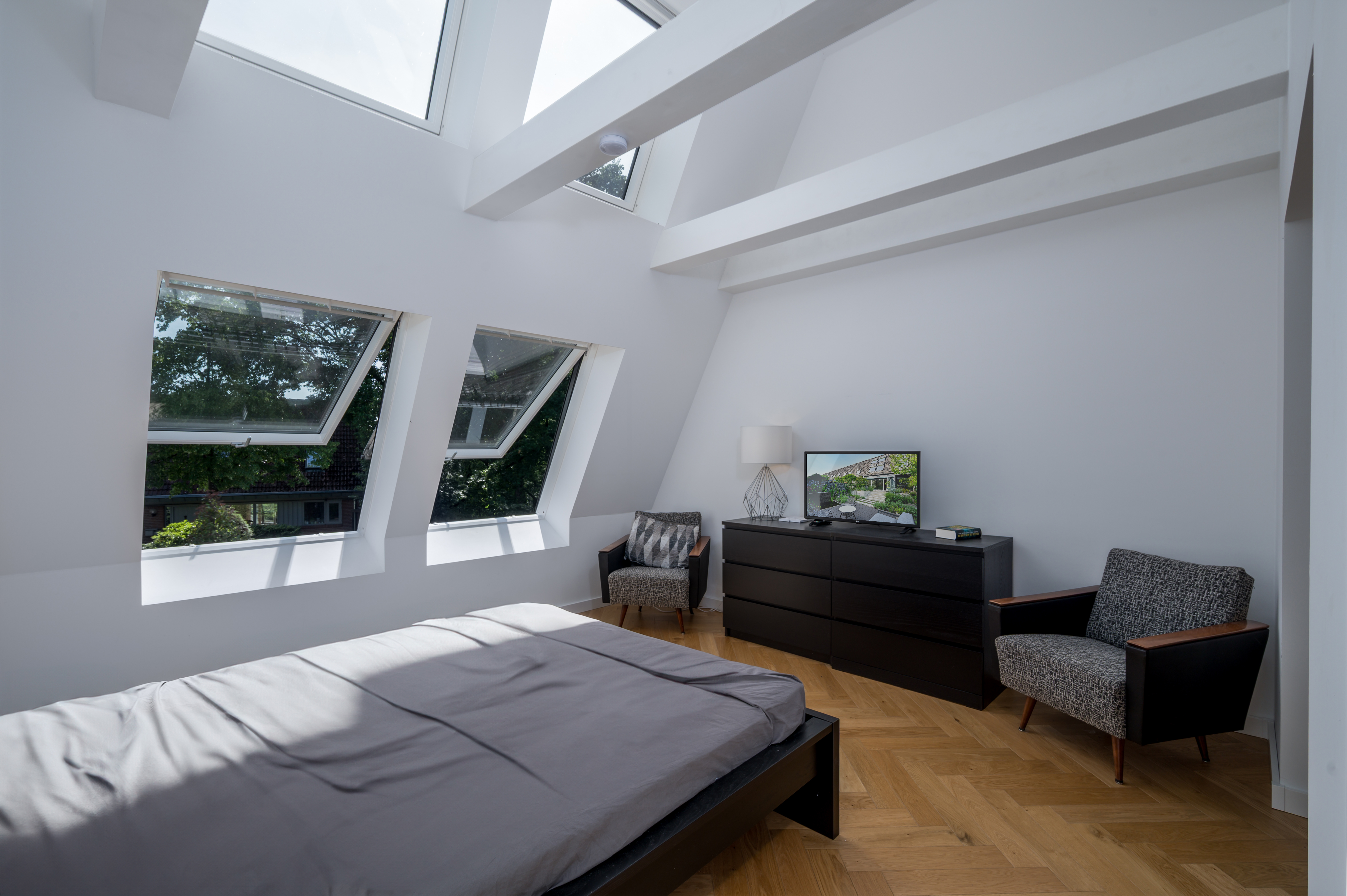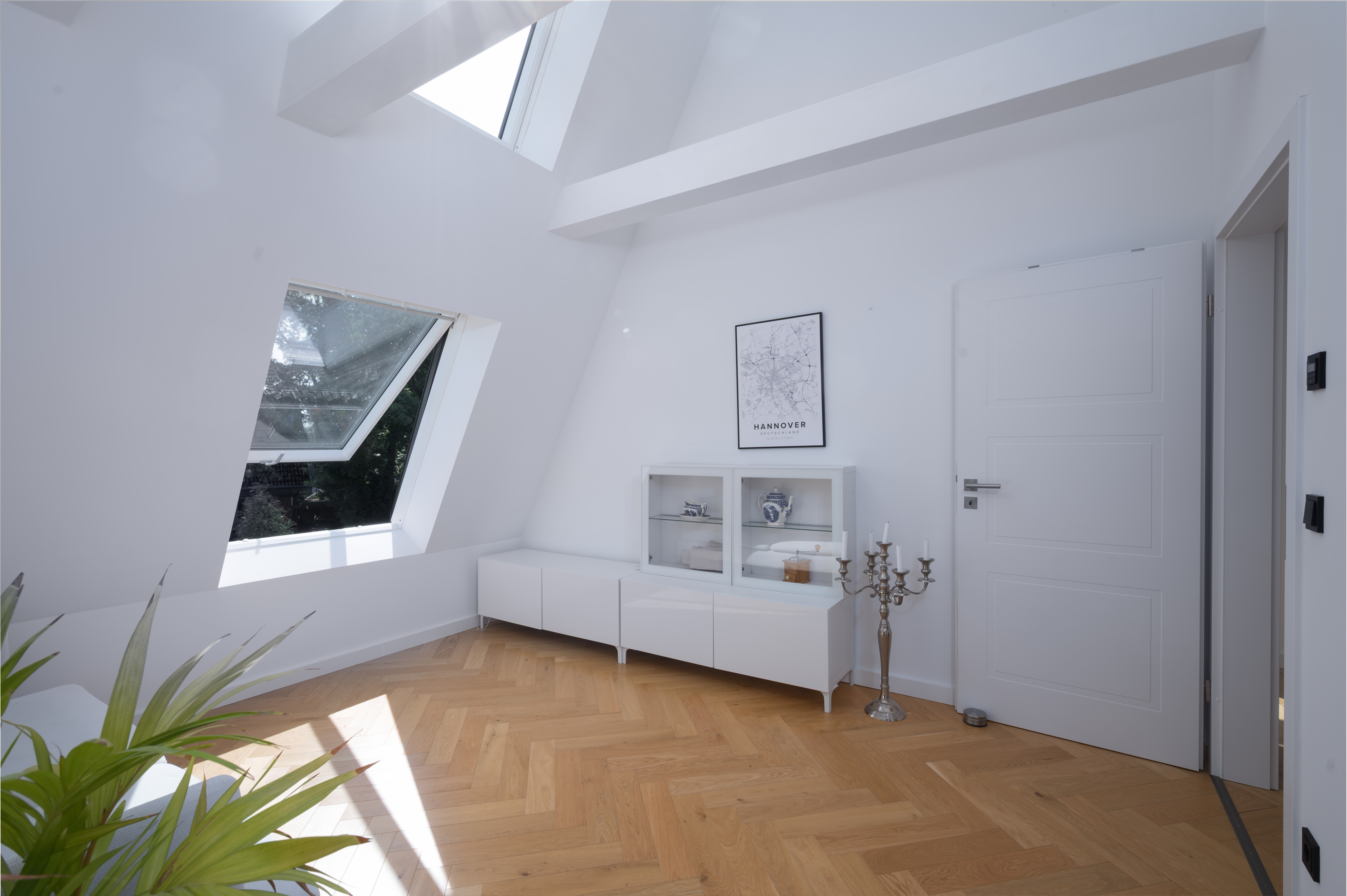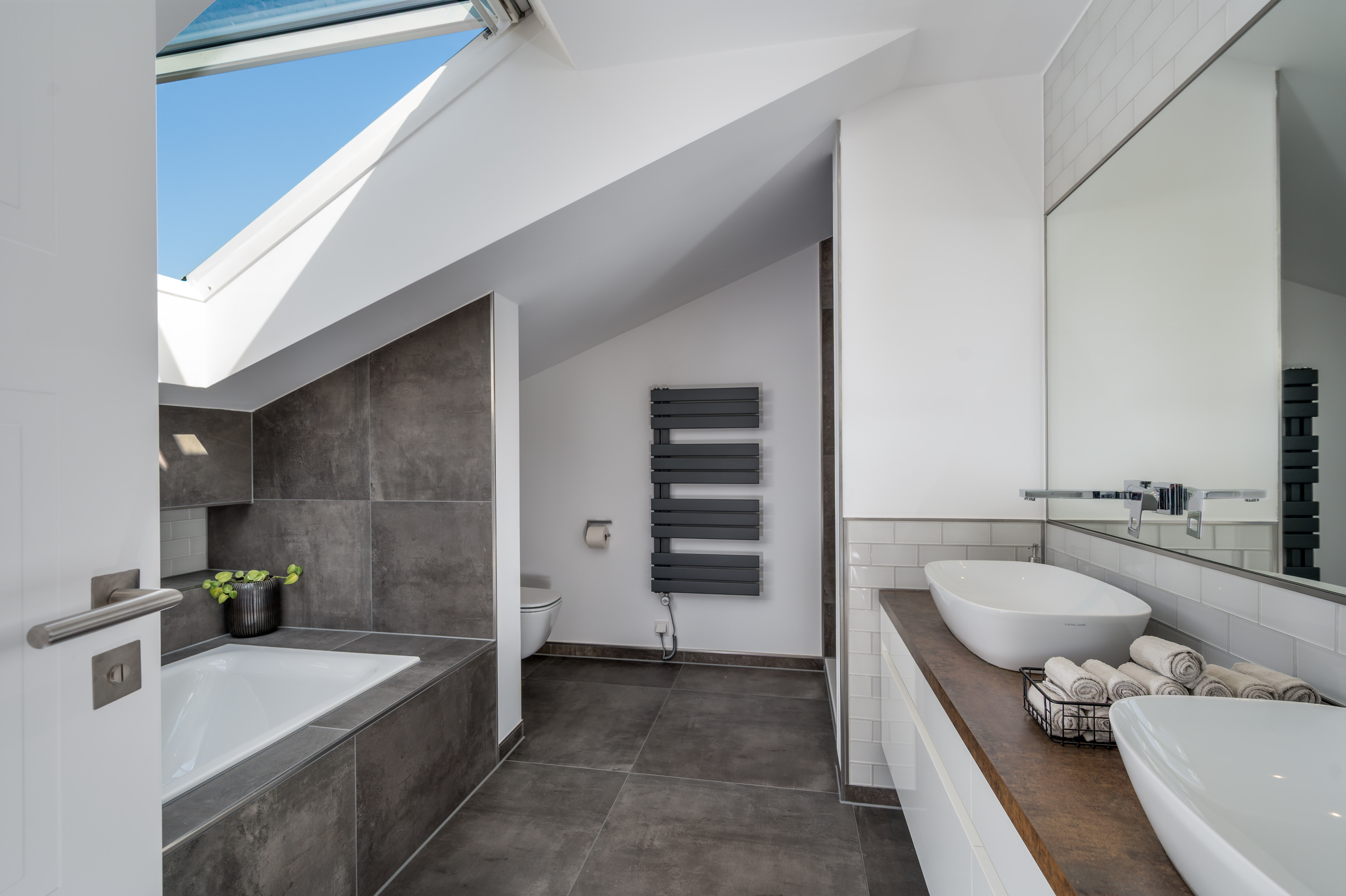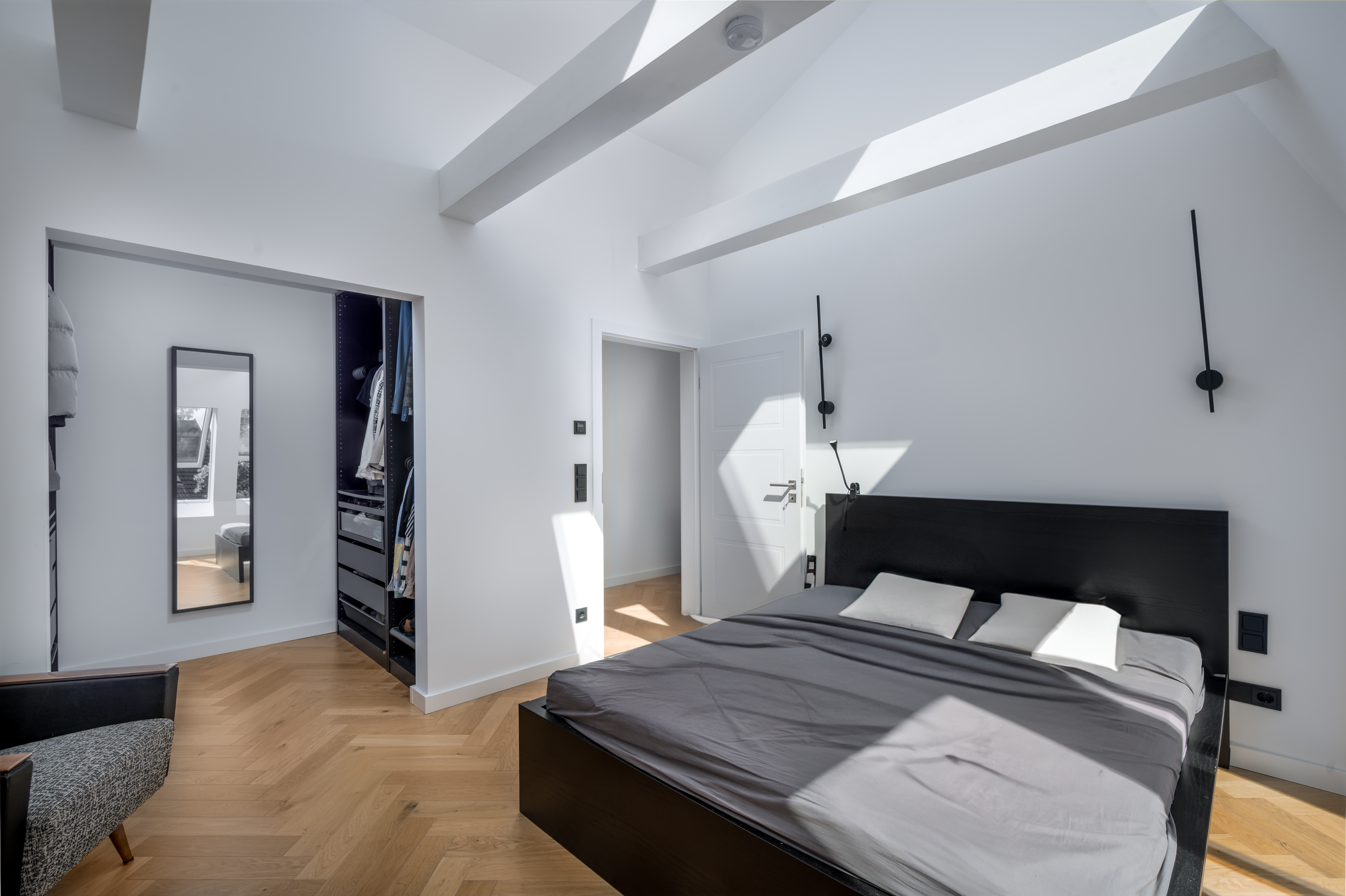 Das Obergeschoss begeistert durch seine großzügige Höhe, sichtbare Balken und helle Atmosphäre. Hier stehen zwei weitere Räume zur Verfügung, darunter ein Schlafzimmer mit begehbarer Ankleide. Das stilvolle Bad überzeugt mit großformatigen Fliesen, Doppelwaschtisch, bodengleicher Dusche und freistehender Wanne – edel akzentuiert durch bronzefarbene Elemente und ein harmonisches Lichtkonzept.