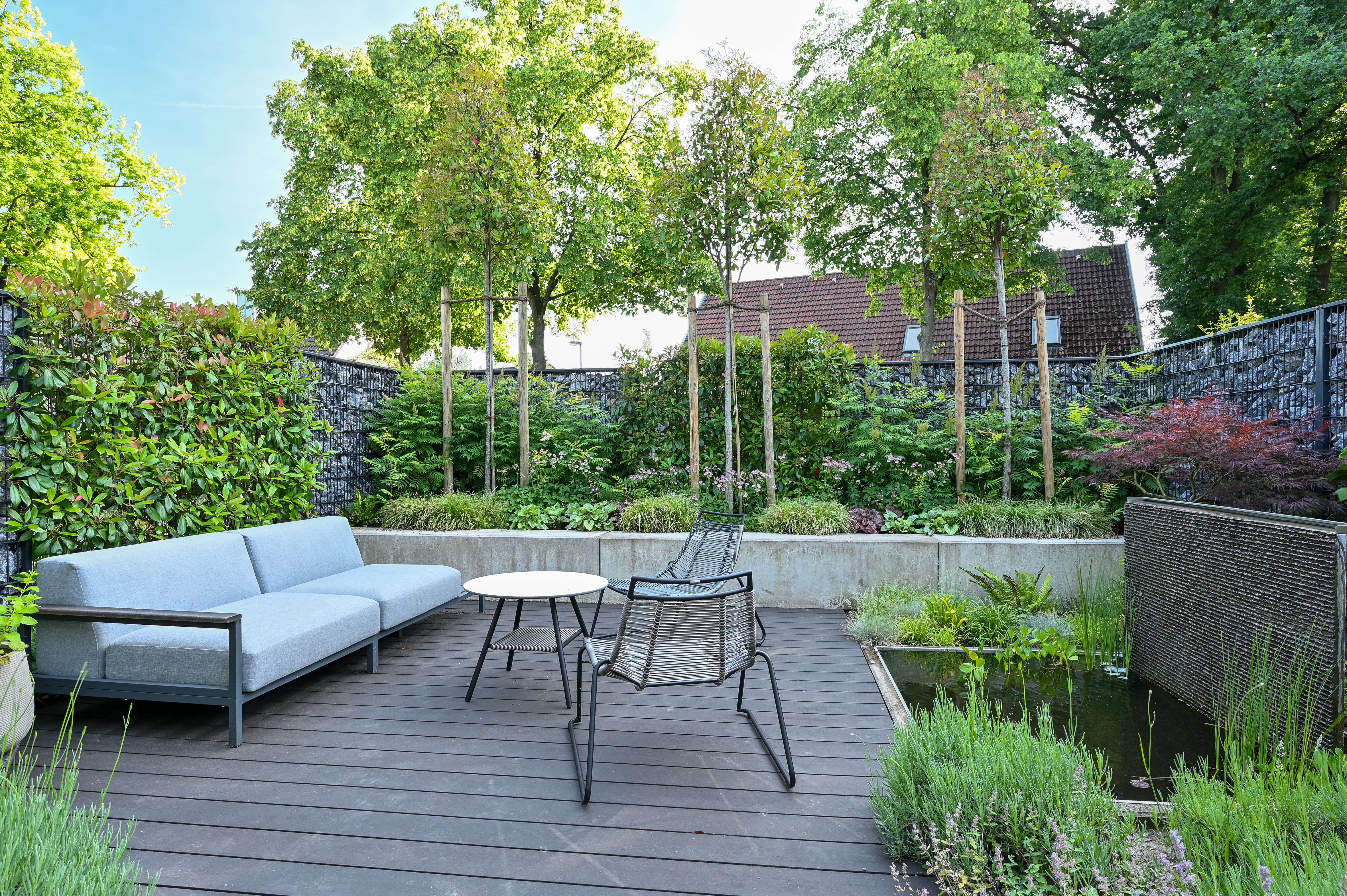• Liebevoll angelegter, blickgeschützter Garten mit Sitzbereich, Wasserelement und kleinem Teich